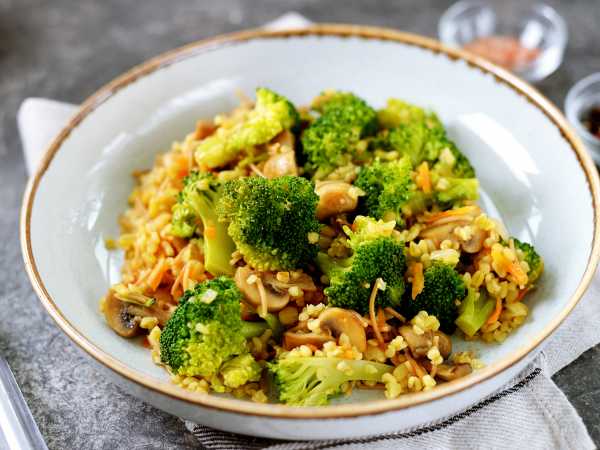 Когда овощи в сотейнике будут практически готовы, переложите к ним стебель брокколи и нарезанный чеснок, варите еще 5 минут.