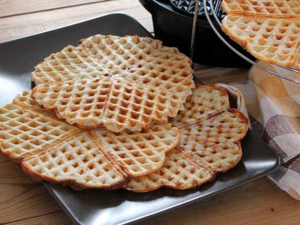 Закройте крышку и выпекайте вафли в течение 5-7 минут, до золотистого цвета. Готовые вафли остудите на решётке.