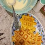 Разогрейте электровафельницу и вылейте примерно по 1,5 столовых ложки на одну вафлю. Можете предварительно смазать панели вафельницы растительным маслом. Рисовая мука имеет особенность оседать на дно, поэтому перед выпечкой перемешивайте тесто ложкой до самого дна и только после этого наливайте на панель вафельницы.