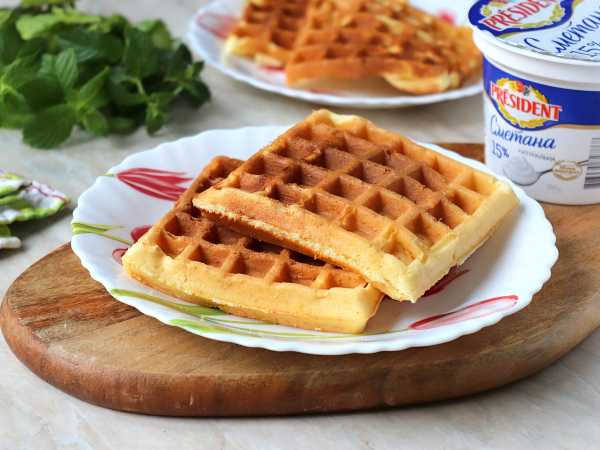 В это время прогрейте вафельницу. Как только ее панели станут горячими, смажьте их растительным маслом или кусочком маргарина. Выложите 2 ст.л. теста на нижнюю панель и накройте верхней. В зависимости от мощности вашей вафельницы, выпекайте вафли примерно 3-5 минут до румяности.