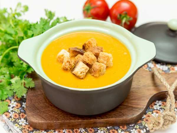 Перелейте теплый диетический томатный суп в глубокие тарелки или пиалы, украсьте свежим базиликом или другой зеленью и подайте к столу. Можно дополнить гренками или сухариками, поджаренными тостами.