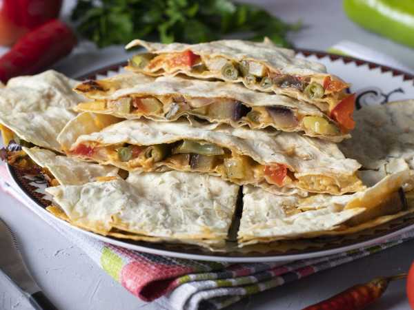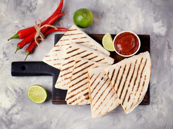 Кесадильи с беконом, курицей и сыром готовы. Разрезать каждую на 3 части и подать к столу.