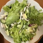 Подготовьте все продукты для диетического салата с кальмарами (ПП). Кальмара предварительно разморозьте, удалите хитиновую жилку и внутренности, промойте под проточной водой вместе с огурцом, салатом и петрушкой.