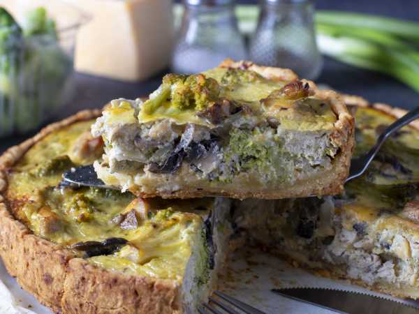 Основные продукты: куриное филе, грибы, сливки, сыр, лук, мука, яйцо, маргарин и помидоры.