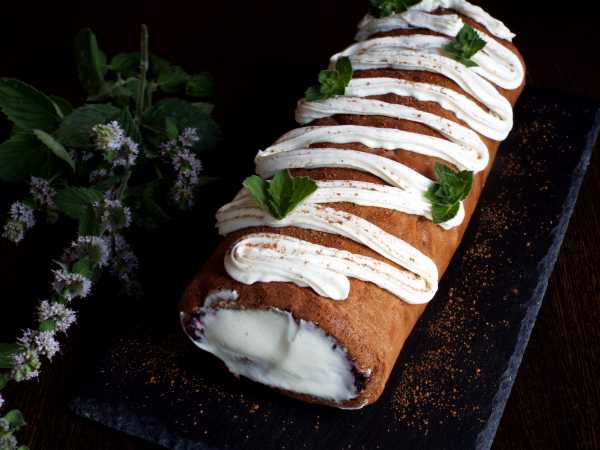... и сверните в рулет, помогая себе пергаментом, на котором лежал бисквитный пласт.