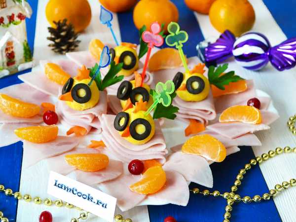 Маслины нарезать полосками и разложить на поверхности, имитируя тигровый окрас. Яркие и вкусные канапе "Тигровые ёлочки" готовы!