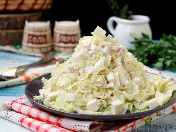 Сыр натрите на средней или мелкой тёрке. Выложите в салат и промажьте небольшим количеством майонеза.