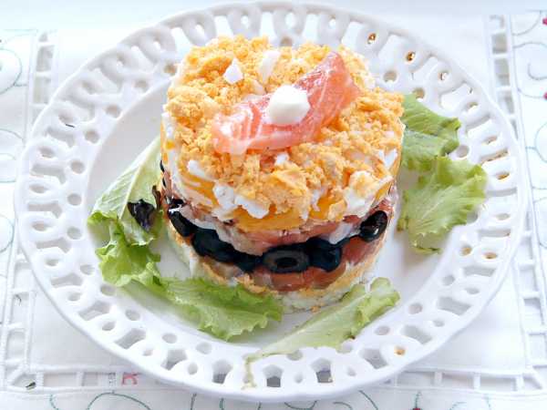 Салат слоёный, можно готовить в салатнике, а можно на тарелке с использованием сервировочного кольца.