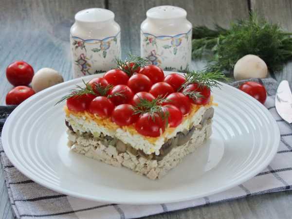 Слоеный салат «Чингисхан» с курицей, черносливом и орехами готов. Подавайте салат охлаждённым.