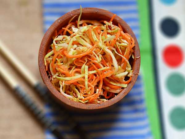 Для приготовления салата нужно взять дайкон, плод красного сладкого перца, лук-порей, черешковый сельдерей, морковь, масло подсолнечное рафинированное и соль.