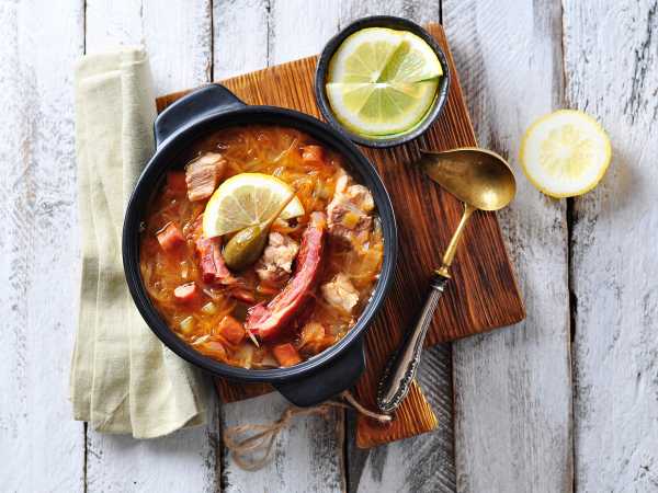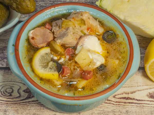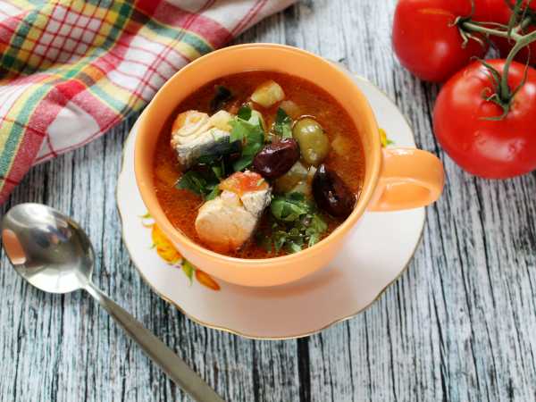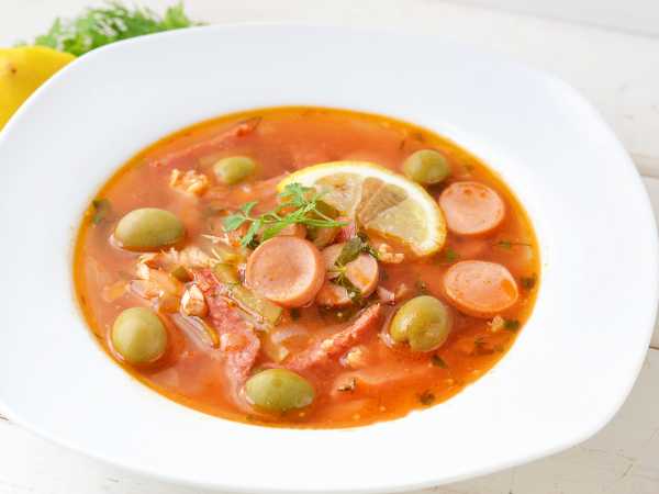 А теперь настало время соединить части солянки: вводим заправку в бульон и томим на небольшом огне еще минут 10. Затем добавляем оливки, целые или нарезанные кружочками.
