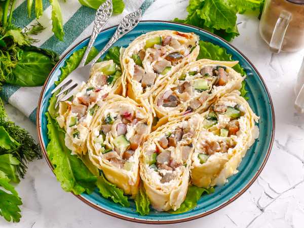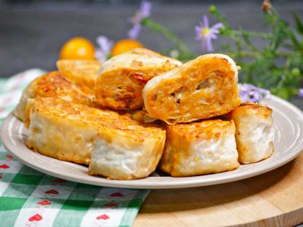 Подверните с боков края лаваша, затем скрутите лаваш с начинкой в рулет. Обжарьте бухлаваш на сковороде, на гриле или запеките до хрустящей корочки в духовке на противне.