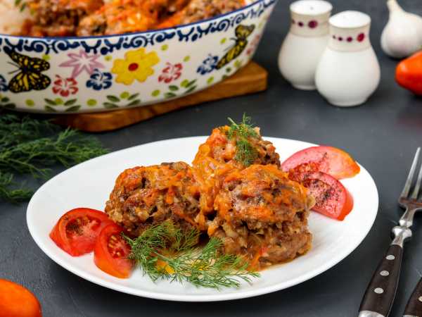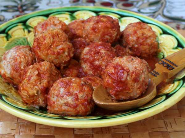 Залейте тефтели томатным соусом и поставьте форму в предварительно разогретую духовку на 30 минут.