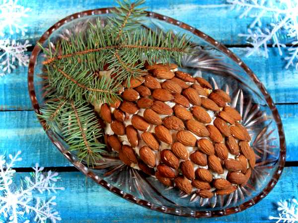 Подправить салат со всех сторон, чтоб было красиво и аккуратно, украсить маслинами, нарезанными кружочками. По желанию можно также добавить ягоды клюквы, калины или смородины. Дать салату 1-2 часа для пропитки.