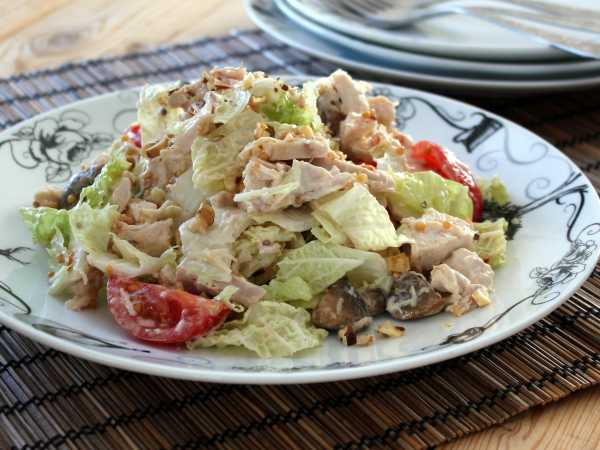 Нарезать кубиками курицу и выложить сверху грибов, поперчить и смазать майонезом.