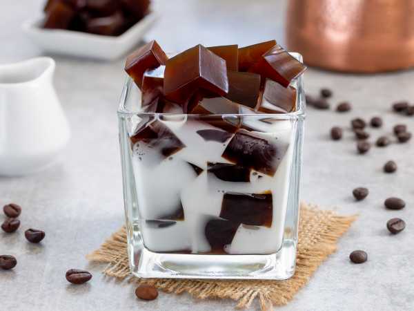 Через пару минут смесь перемешать, перелить в ёмкость побольше и добавить набухший желатин. Массу перемешать до растворения желатина.