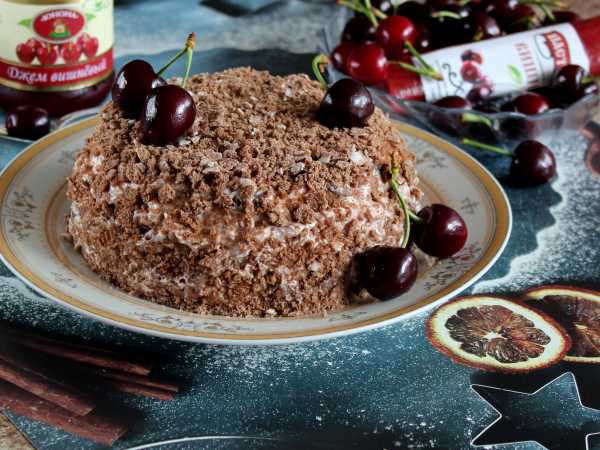 Затем освободите от формы и разместите на блюде. Срезанные верхушки бисквитов измельчите в процессоре в крошку, бока смажьте оставшимся кремом и украсьте крошкой.