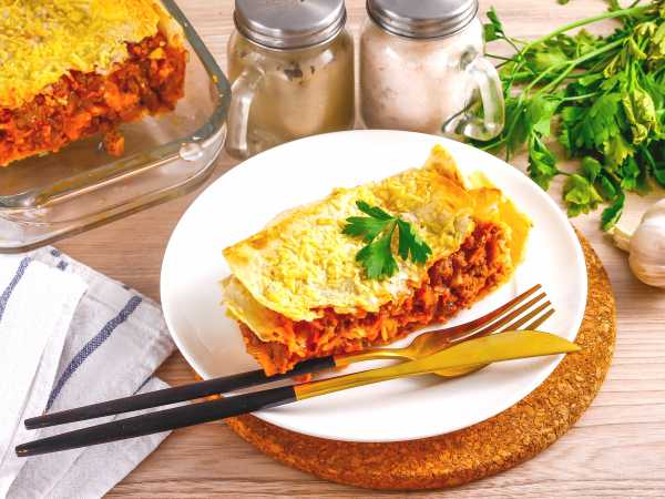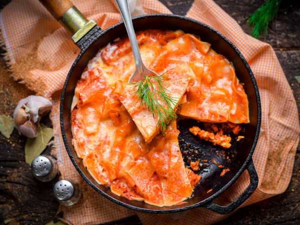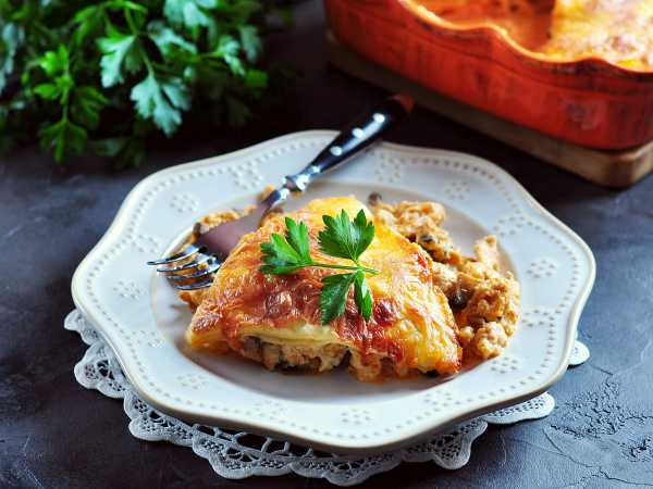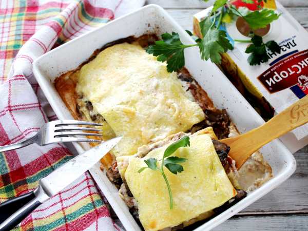 Лазанья из лаваша с курицей и грибами готова. Достаньте её из духовки и оставьте немного остыть.