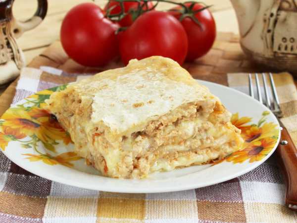 Последний слой: лист лаваша, соус и оставшийся сыр. Поставьте запекаться в заранее разогретую до 200 градусов духовку на 20-30 минут.