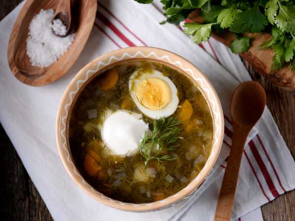 Щи с капустой и щавелем готовы! Подавайте суп со сметаной и половинкой варёного яйца.