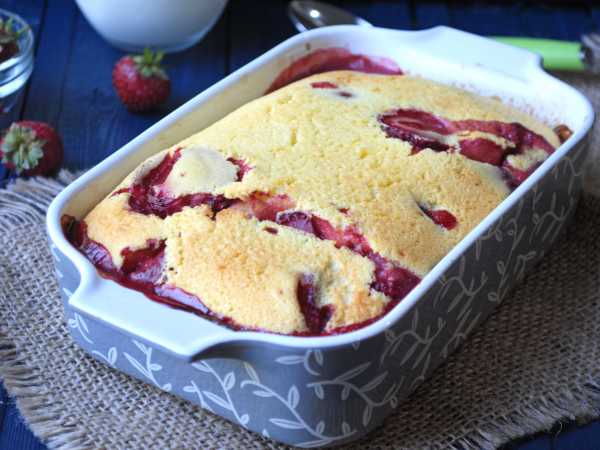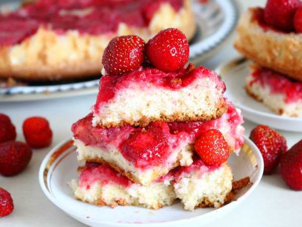 Простой и быстрый пирог с клубникой готов. Охладим его и нарежем на аппетитные кусочки. Приятного аппетита!