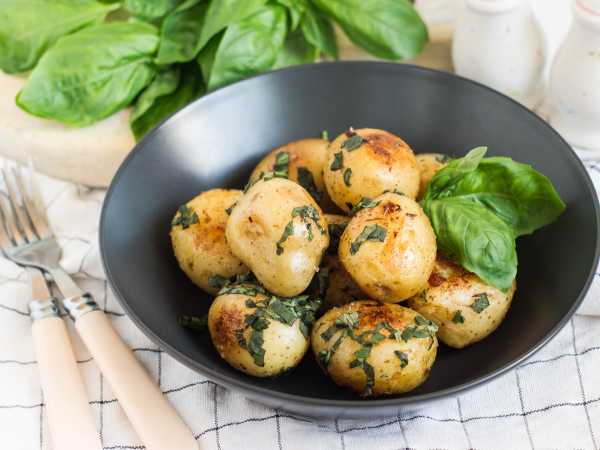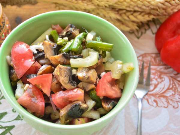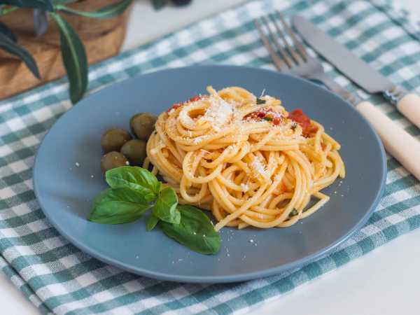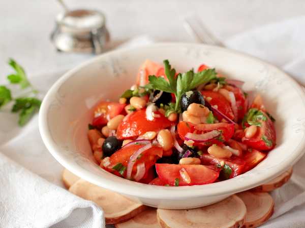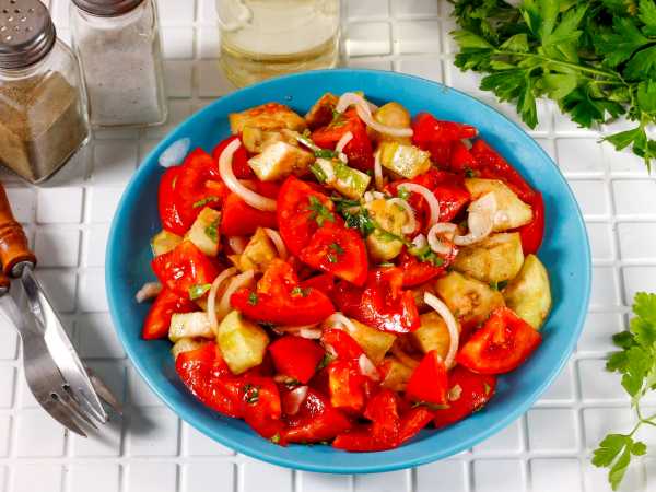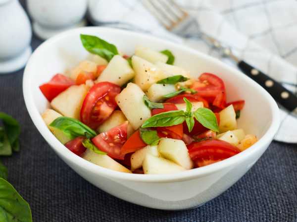 Листья базилика можно и порвать руками. Помидоры, если мелкие, можно и вовсе не разрезать пополам, а добавить как есть. А если нет черри, так и обычные сойдут, которые можно нарезать так, как удобно вам.