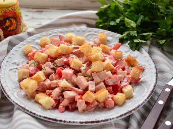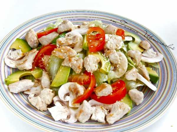 Классический салат «Цезарь» с индейкой готов! Перемешивайте салат исключительно за столом, чтобы сухарики не размокли.