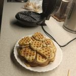 Аккуратно выкладывать по 2 столовые ложки теста на вафельницу и выпекать 3-5 минут до золотистого цвета.