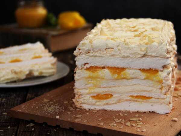 Собрать торт. Смазать коржи сметанным кремом, чередуя с черничным конфи.
