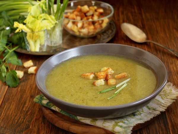 Подавайте суп-пюре из кольраби горячим, предложив сухарики и свежую зелень.