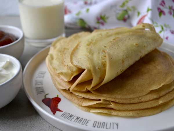 Блины на сметане без яиц готовы. Можно смазать блинчики сливочным маслом, подать к ним сметану, молоко, варенье, мед.