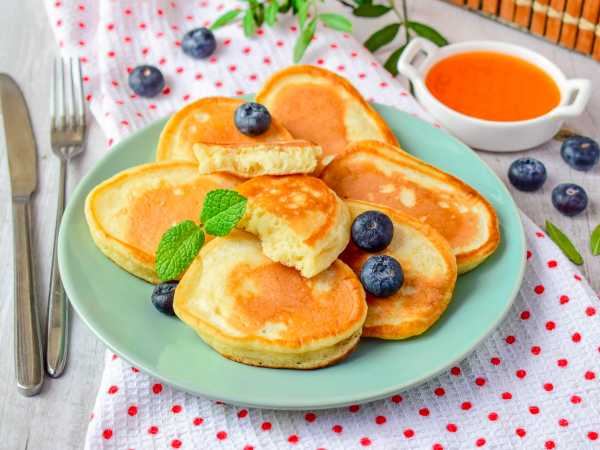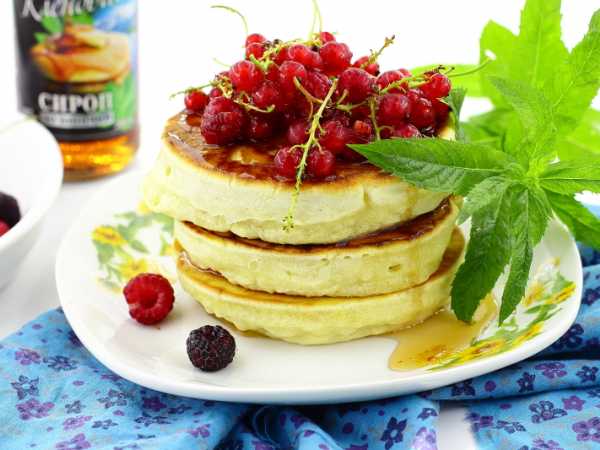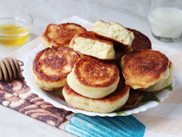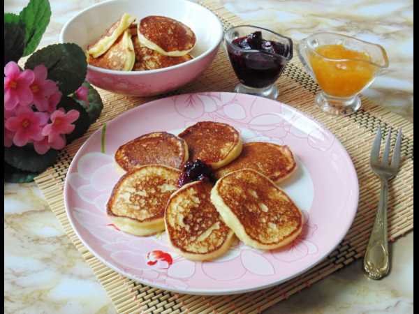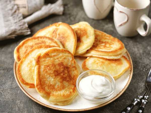 При подаче пышные оладьи на молоке и сметане можно дополнить сметаной или сгущенкой.