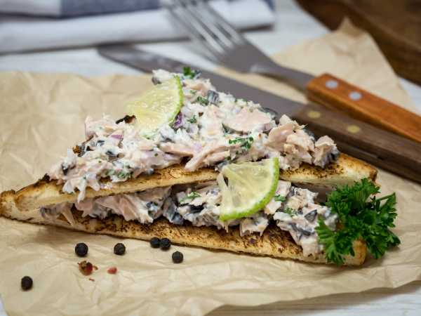 Консервированного тунца лучше всего выбирать кусочками в масле, тогда не нужно будет поливать брускетту дополнительно.