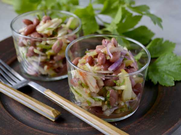 В таком виде миску с салатом можно накрыть крышкой или плёнкой и убрать в холодильник.