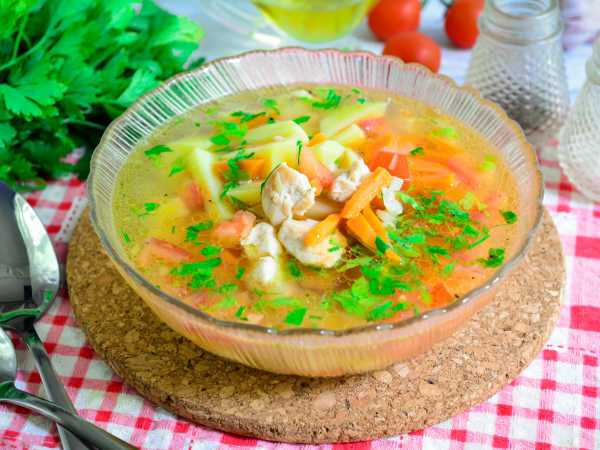 Выложите лапшу быстрого приготовления в глубокую емкость и залейте половиной бульона. Накройте тарелкой и дайте пропариться 10 минут. По желанию лапшу можно отварить вместе с курицей.