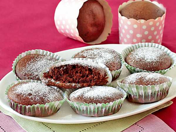 Постные шоколадные кексы с кофе и какао готовы, они у меня чуть не выпрыгнули из форм. По желанию посыпьте кексы сахарной пудрой.