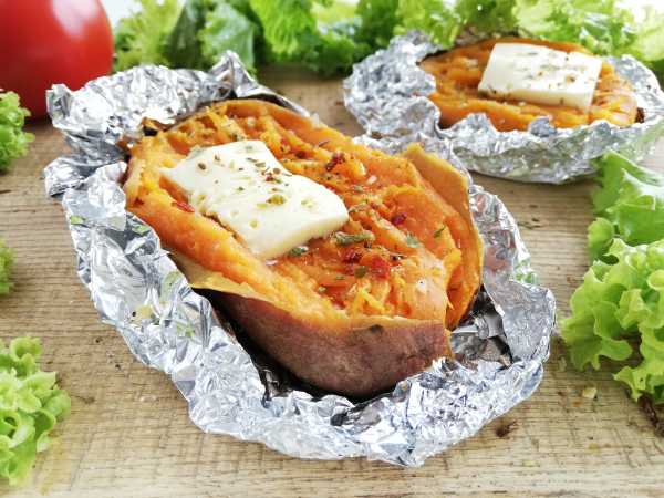 Накройте форму фольгой, поместите в духовку и выпекайте батат 45-50 минут.