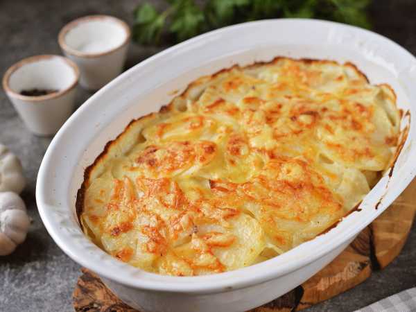 Добавив сливки, поместите форму в духовку еще на 20-25 минут, уже не накрывая фольгой. За это время часть сливок впитается, ломтики батата станут еще более нежными и слегка подрумянятся по краям.