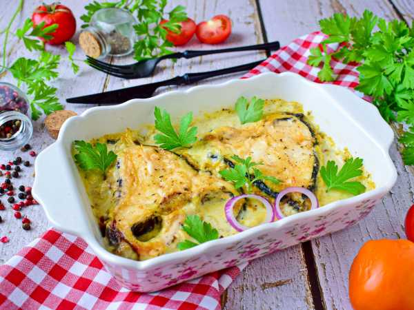 Рыбу нарежьте на порционные кусочки. Форму для выпечки смажьте оливковым маслом, выложите кусочки рыбы, посолите и поперчите.