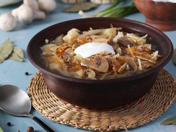 Грибы промойте в воде, нарежьте слайсами и выложите в ковш или казан. Залейте бульоном и отварите примерно 4-5 минут на умеренном нагреве. Всыпьте в бульон 1 щепотку соли и молотого черного перца.