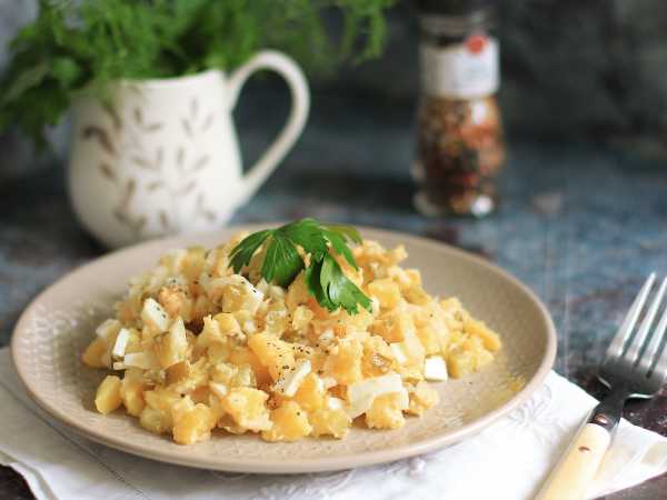 Очистите вареную картошку от кожуры и нарежьте некрупным кубиком. Сложите картофель в миску и сразу полейте оливковым маслом (1 ст.л.), перемешайте, чтобы кубики картофеля не слиплись между собой.