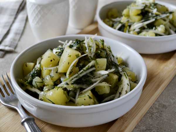 Картофель отварите в кожуре до готовности и полностью охладите.