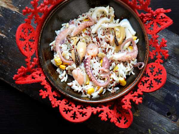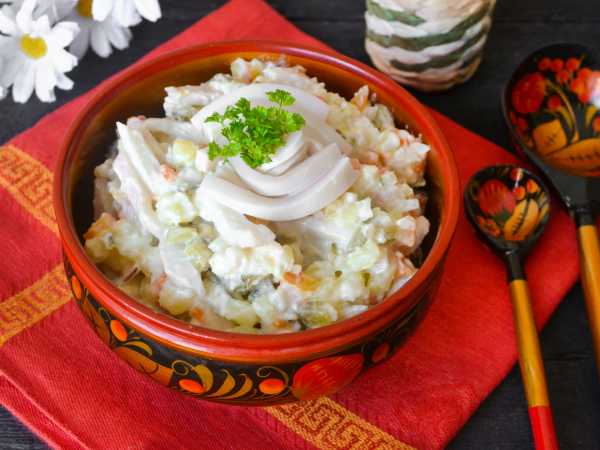Последним нарежьте кальмара и добавьте его в емкость вместе с майонезом любой жирности, солью и молотым черным перцем. Аккуратно все перемешайте.