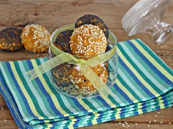 Кранчи с маком выросли в объеме. Смажьте их яйцом и посыпьте подготовленными орехами. Выпекайте при 180-190 градусах примерно 30 минут, но ориентируйтесь по своей духовке. Поверхность должна стать румяной.