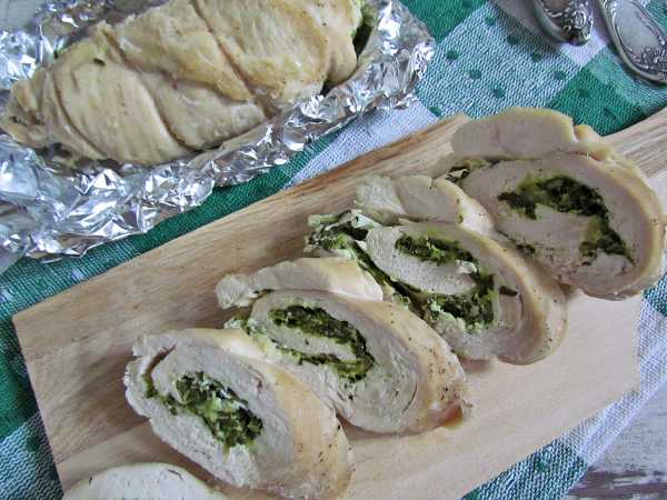 Каждое филе посолите, поперчите. На край выложите столовую ложку жареных грибов с луком, немного тертого сыра и зелени.