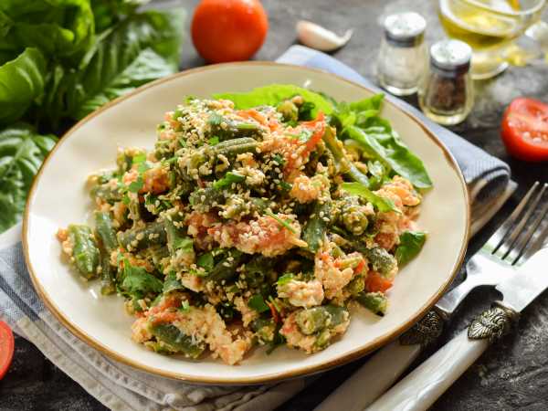 Готовый салат из цветной капусты и стручковой фасоли подавайте к столу сразу же после приготовления.