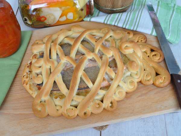 Пышный и румяный рыбный пирог из дрожжевого теста готов. Подавайте его тёплым.