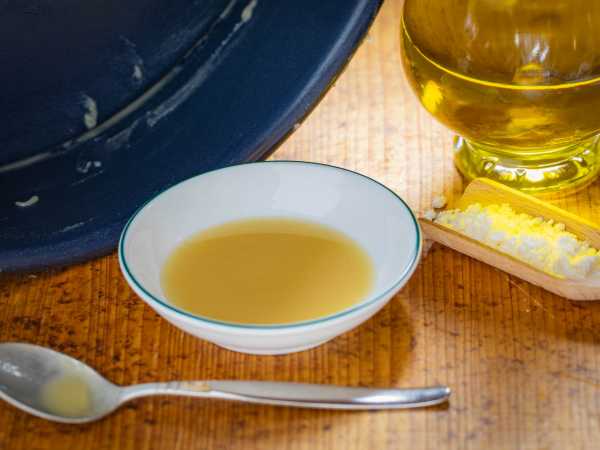 К опаре влить растопленное масло. Оно должно быть теплым, не горячим.