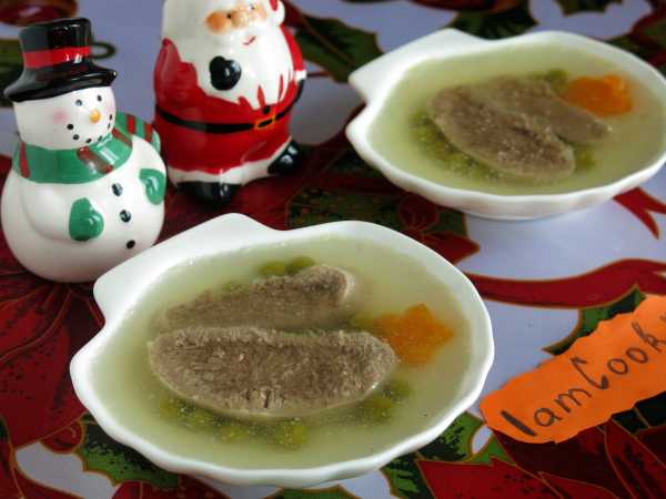 Зальём процеженным бульоном и поставим в холод на 4-5 часов. Когда заливное застынет оно готово.