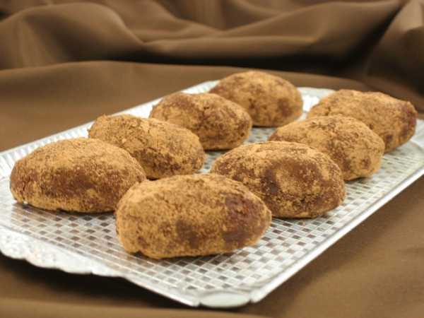 На один бисквитный кружок выдавим через кондитерский мешок с любой насадкой охлажденный шоколадный крем, как на фото, после чего вторым бисквитным кружком накроем часть с кремом, формируя пирожное.